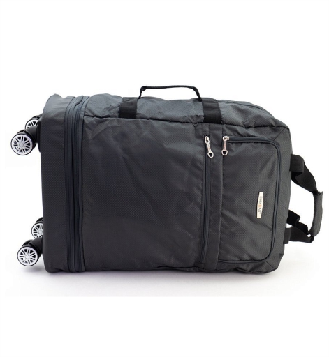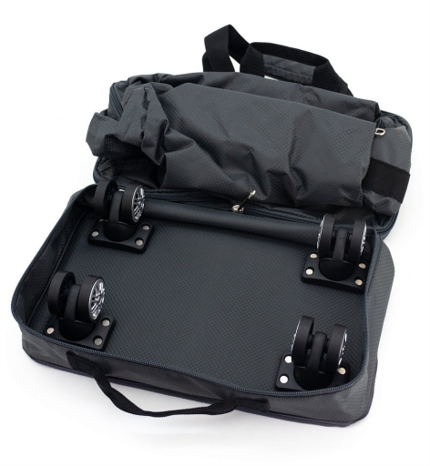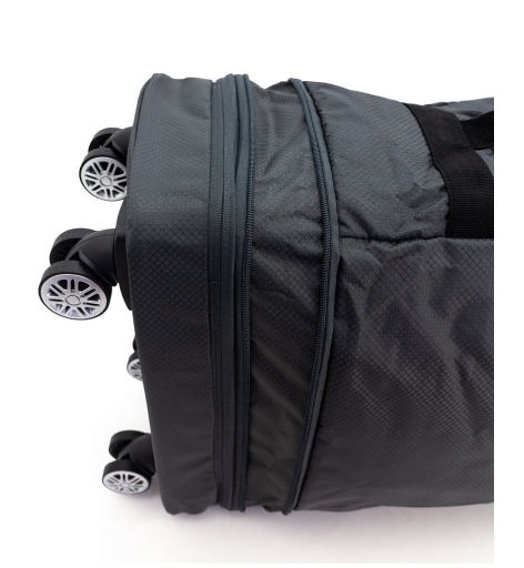 Сумка оснащена двумя ручками, которые можно соединить в одну, зафиксировав на клапан с липучкой, а также боковой ручкой для перемещения сложенного чемоданчика. В разложенном состоянии сумка имеет четыре двойных поворотных колеса, что обеспечивает маневренность и удобство перемещения даже при загруженной сумке.